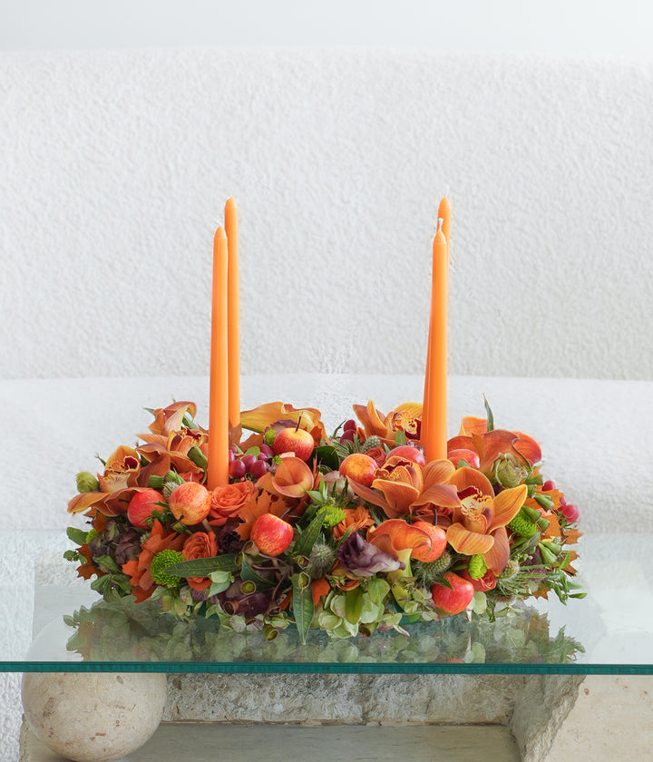 A seasonal centerpiece of orange orchids, roses, berries, hydrangea, and autumn foliage, accented with fresh apples and paired with taper candles. Designed for elegant gatherings, it brings warmth and festive charm to any fall table