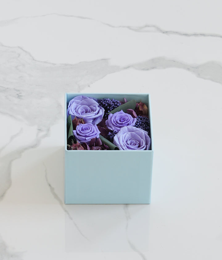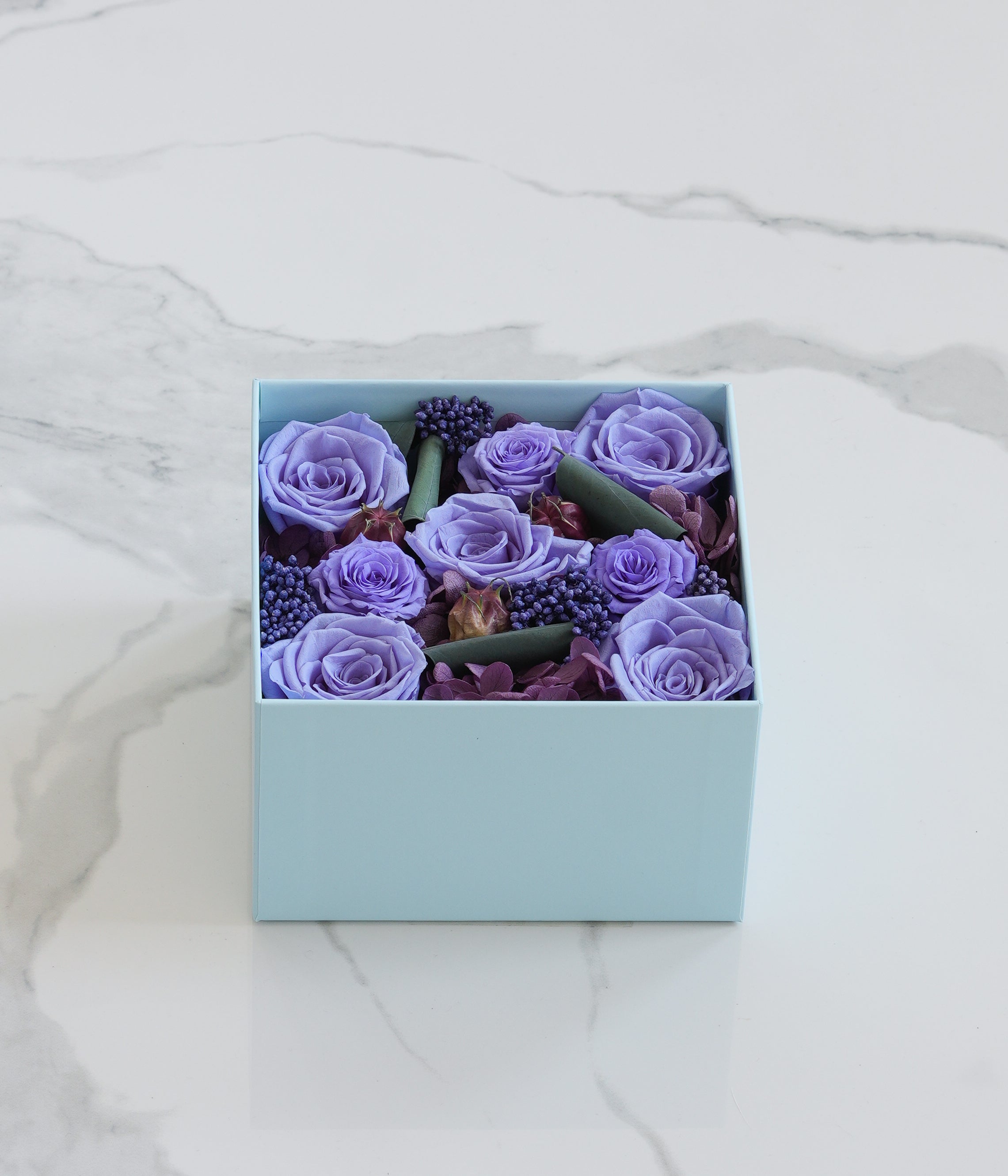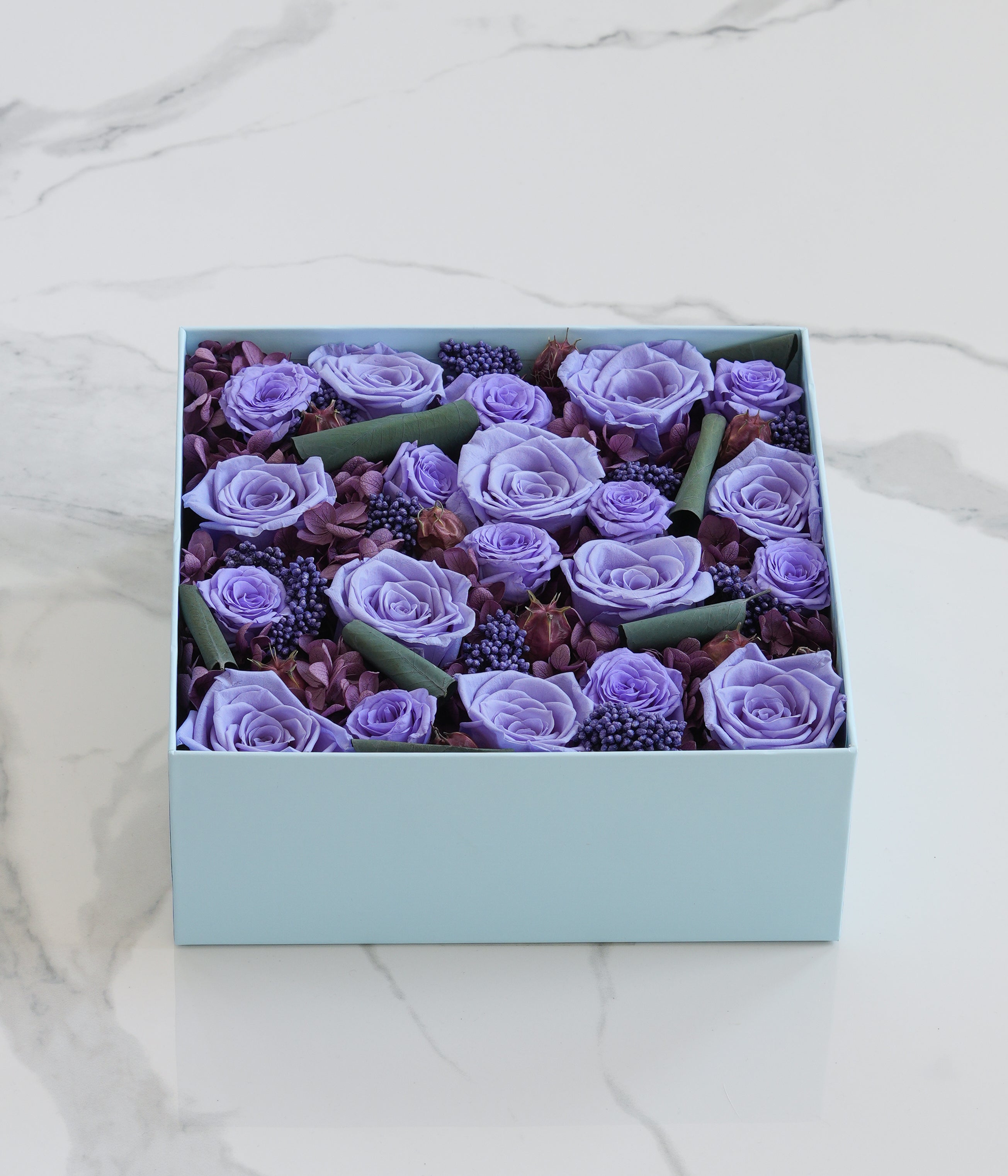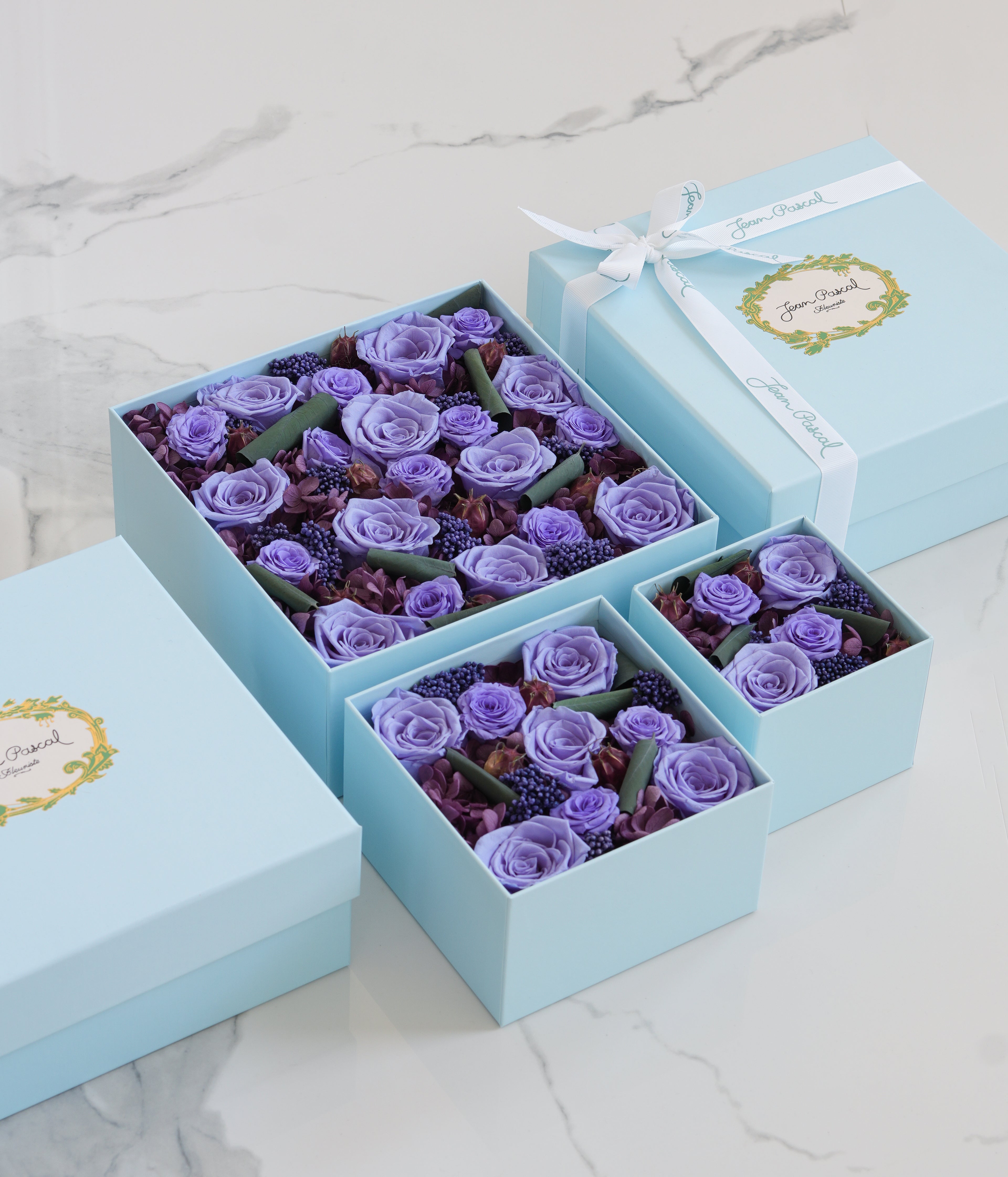 Blackberry Forever Roses and Preserved Flowers delicately nestle in Jean-Pascal’s Signature Box for a truly long-lasting gift.