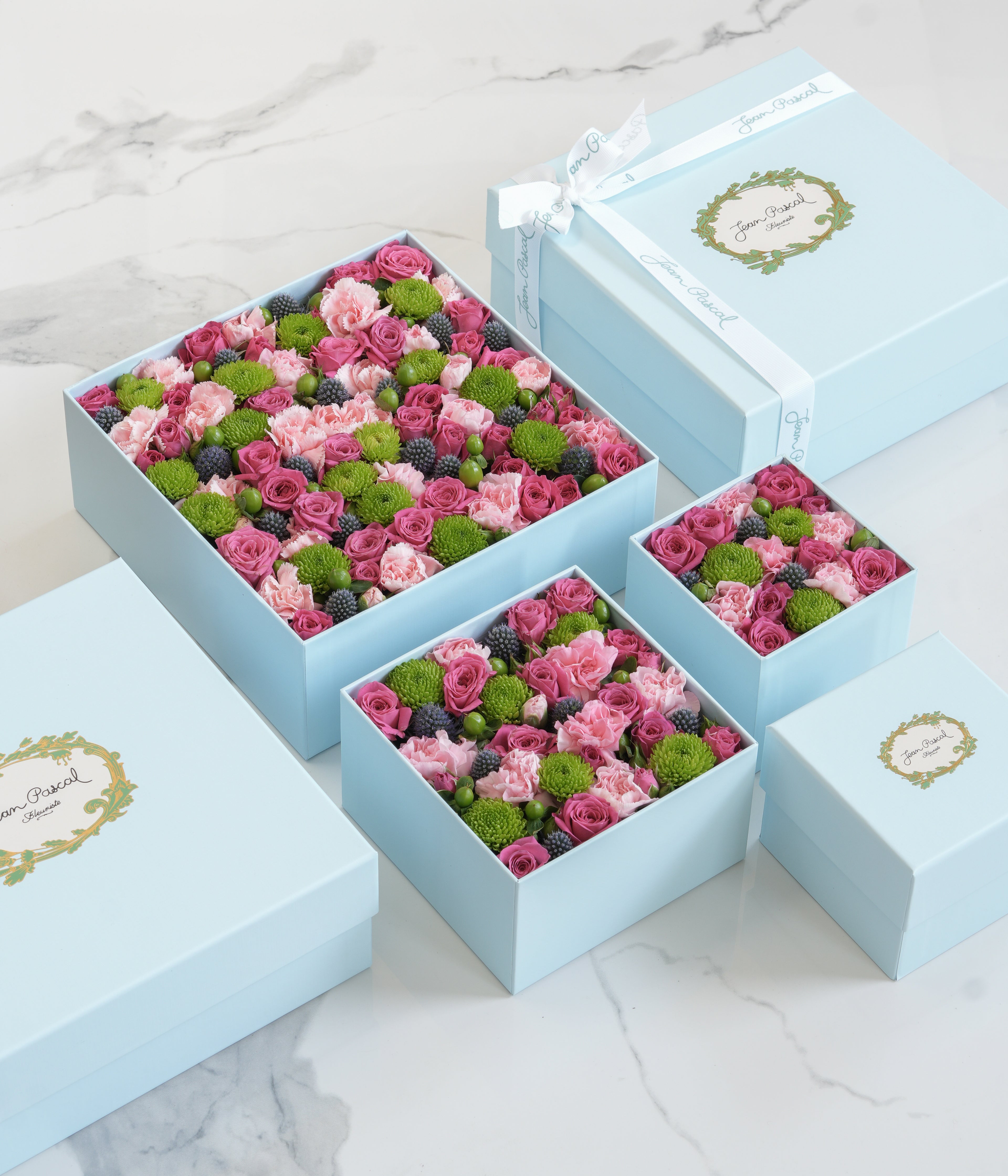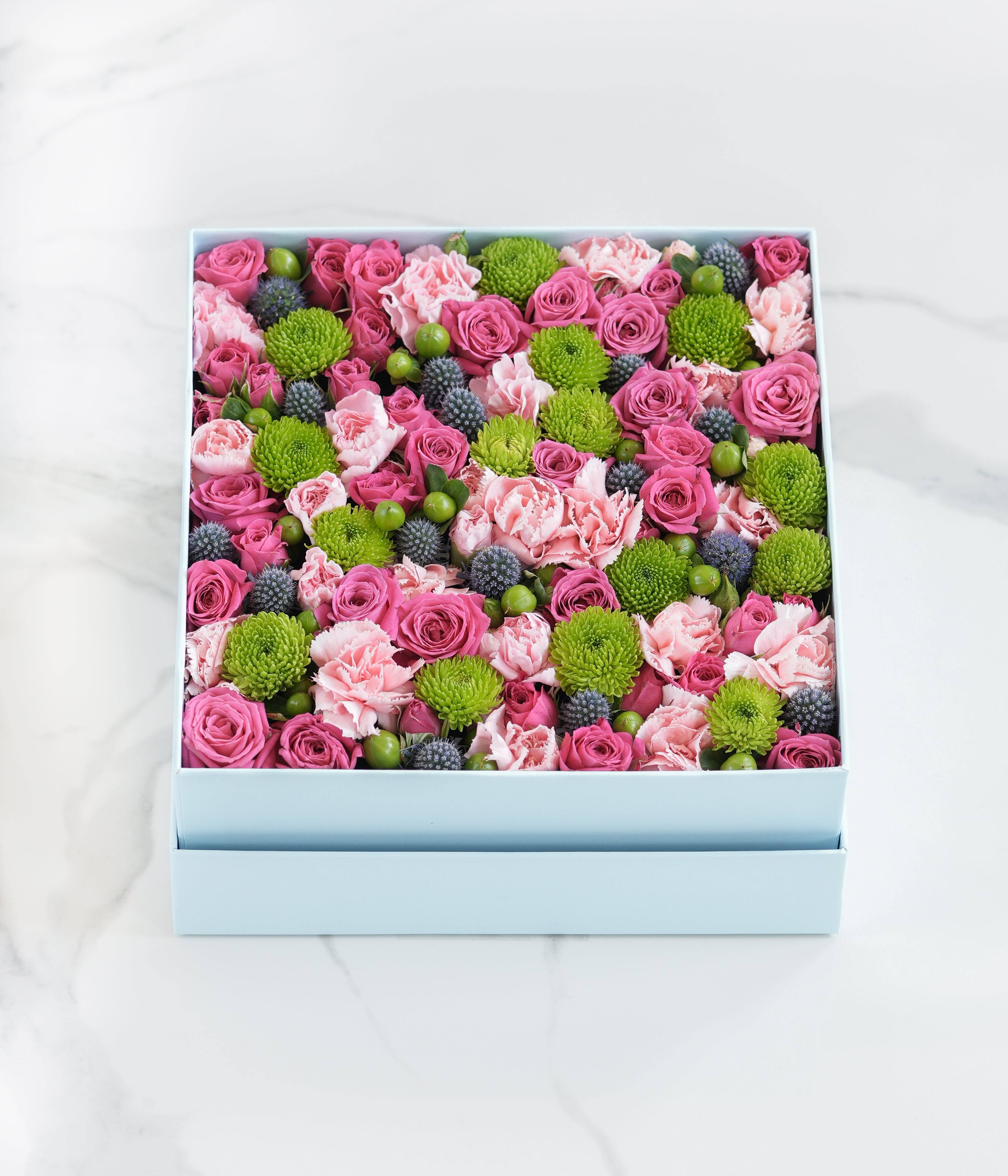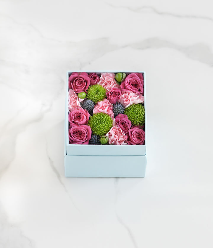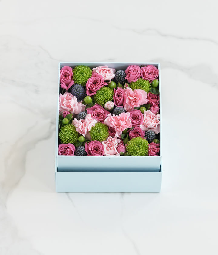 A Fresh Flower Box that surprises you. Filled with Bright flowers, this present includes Hot Pink Miniature Roses and Blue Eryngium.