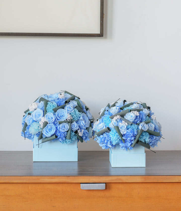 We are delighted to introduce our new blue preserved flower arrangement. This exquisite ensemble features roses, hydrangeas, chrysanthemums and carnations in a beautiful blue and white color palette, presented in our signature Jean-Pascal blue box. A perfect gift that lasts for years.