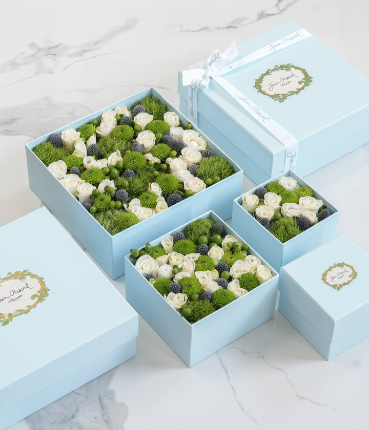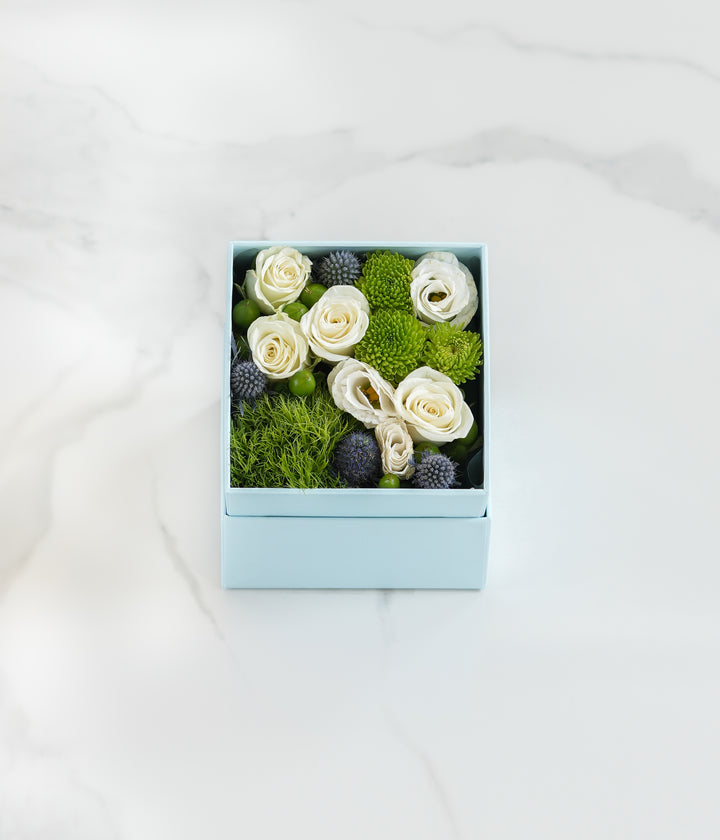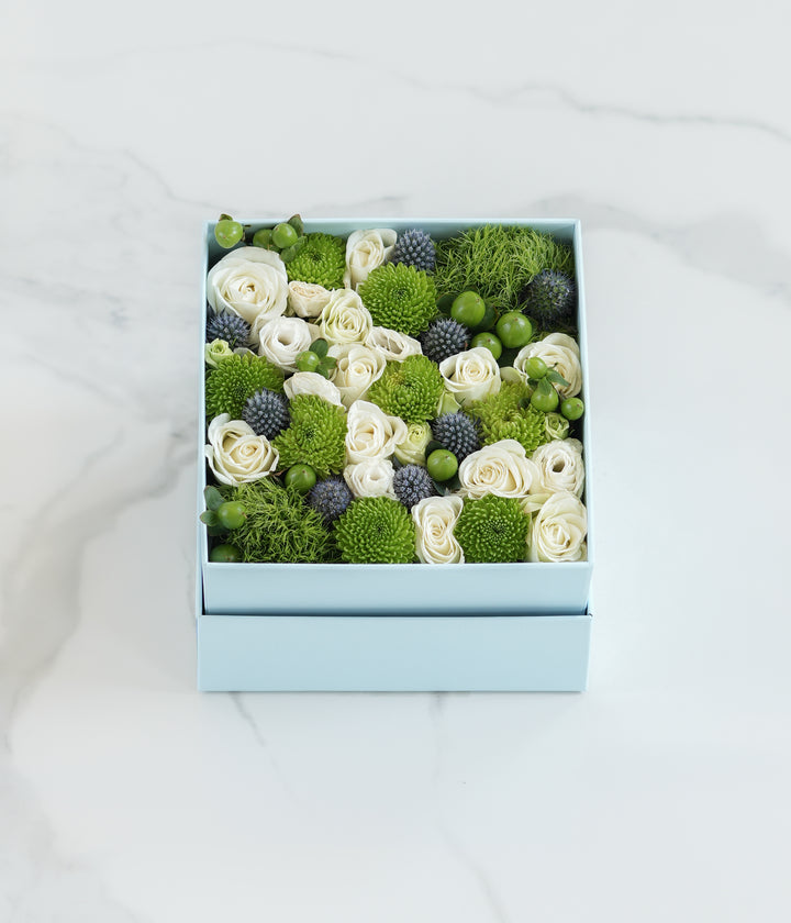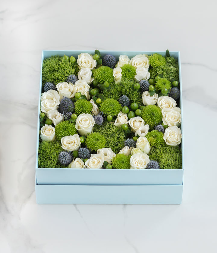 A Fresh Flower Box that surprises you. Filled with green and white flowers, this present includes White Miniature Roses and Green Trick Dianthus.