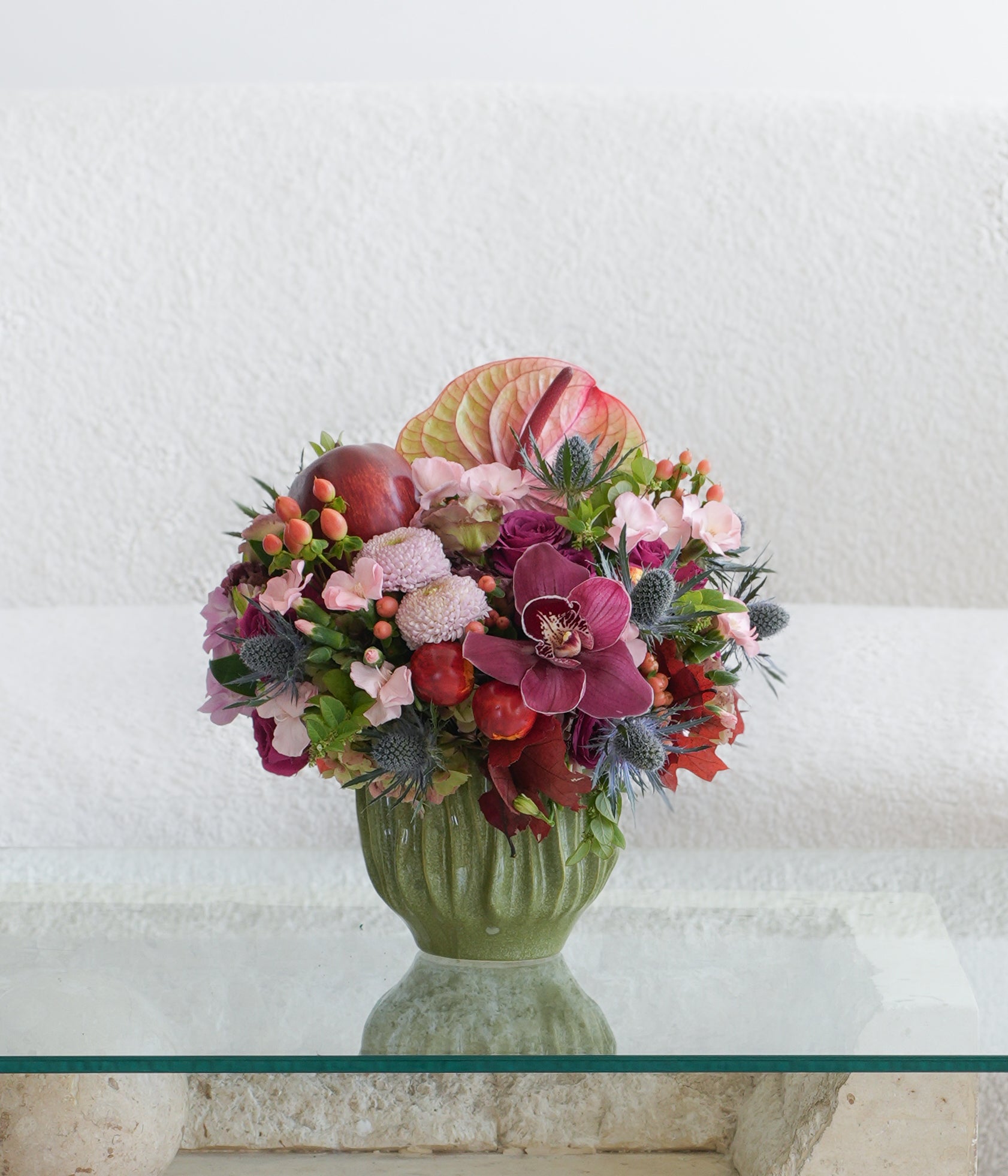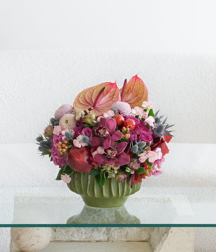 A vibrant fall composition of orchids, anthuriums, roses, hydrangea, and seasonal textures in shades of crimson, blush, and plum. Accented with apples and berries, this lush arrangement brings richness and elegance to any space