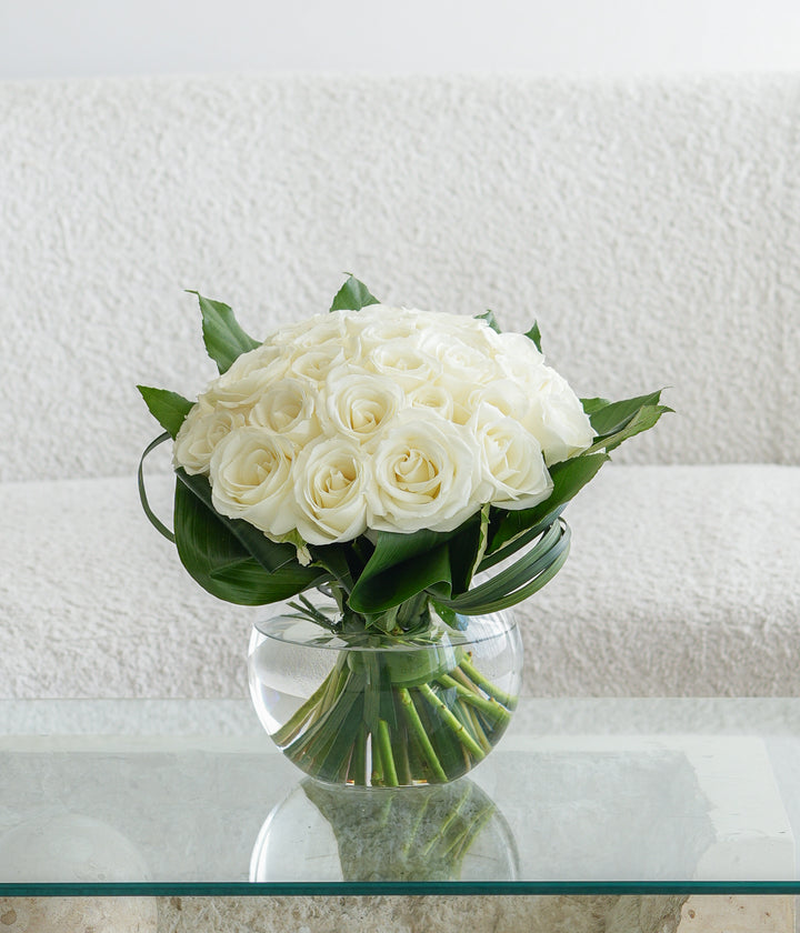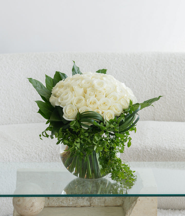 A lavish display of pristine white roses, elegantly arranged in a glass vase and accented with lush cascading greenery. This refined design radiates sophistication and grace, making it a perfect statement piece for luxurious interiors or heartfelt gifting.