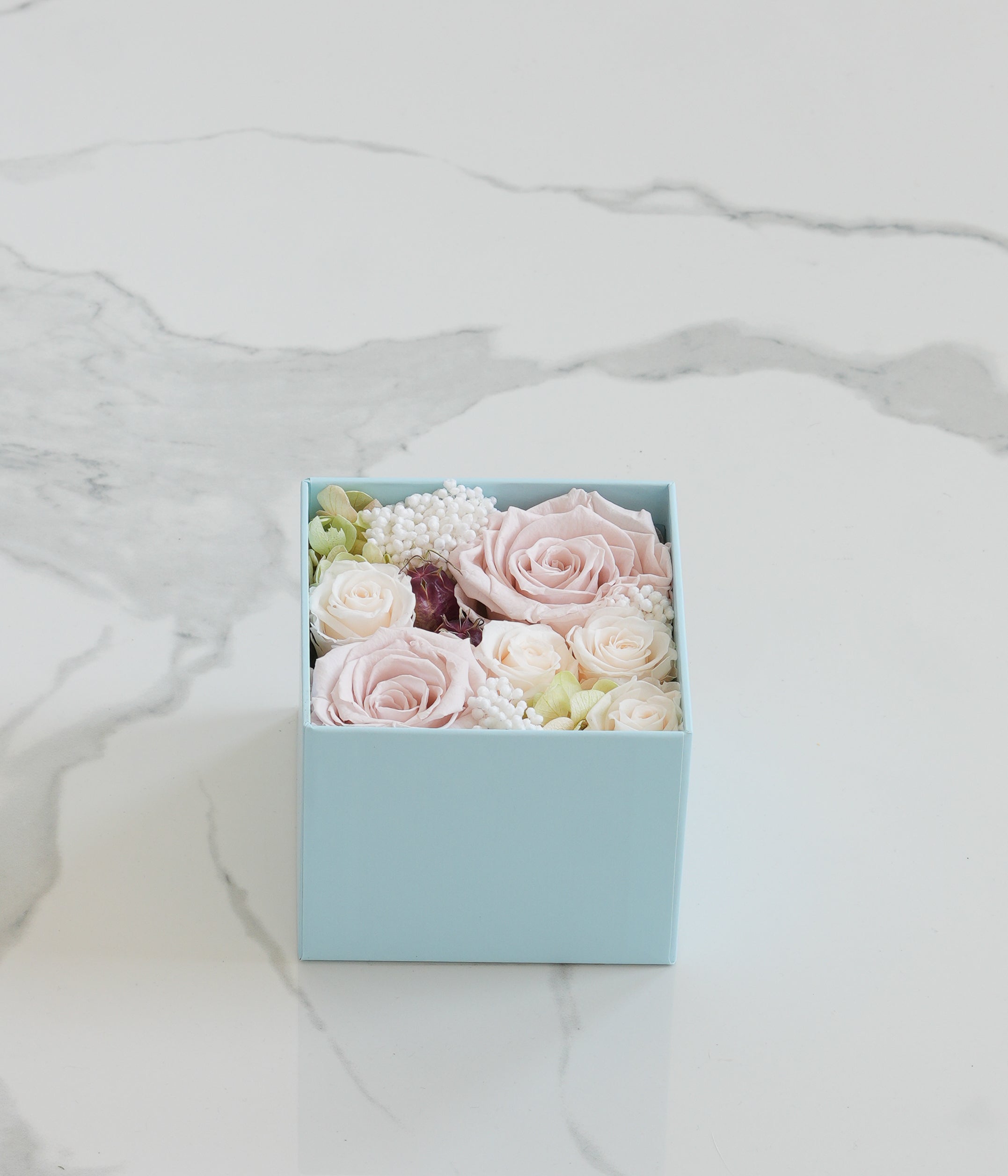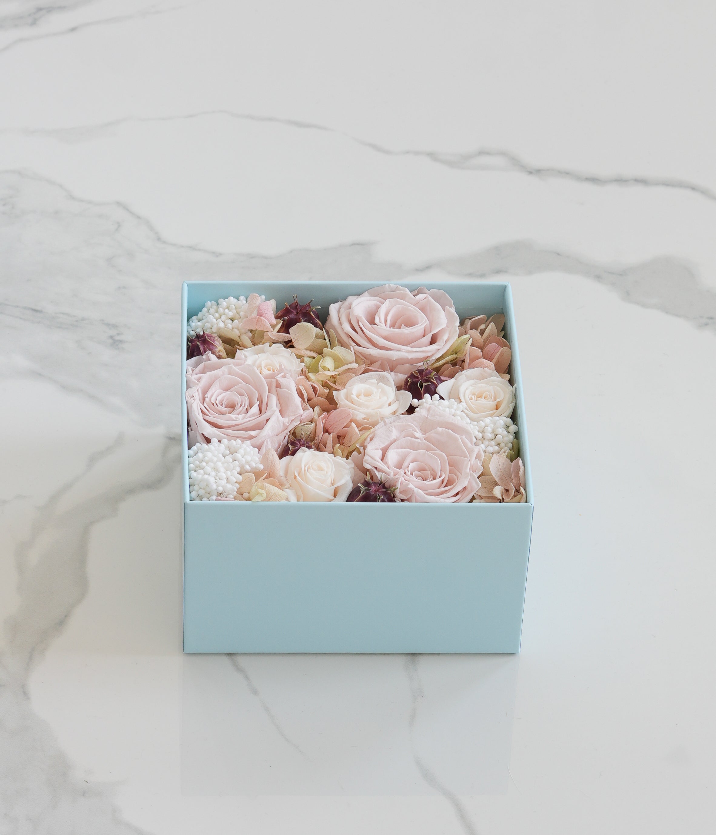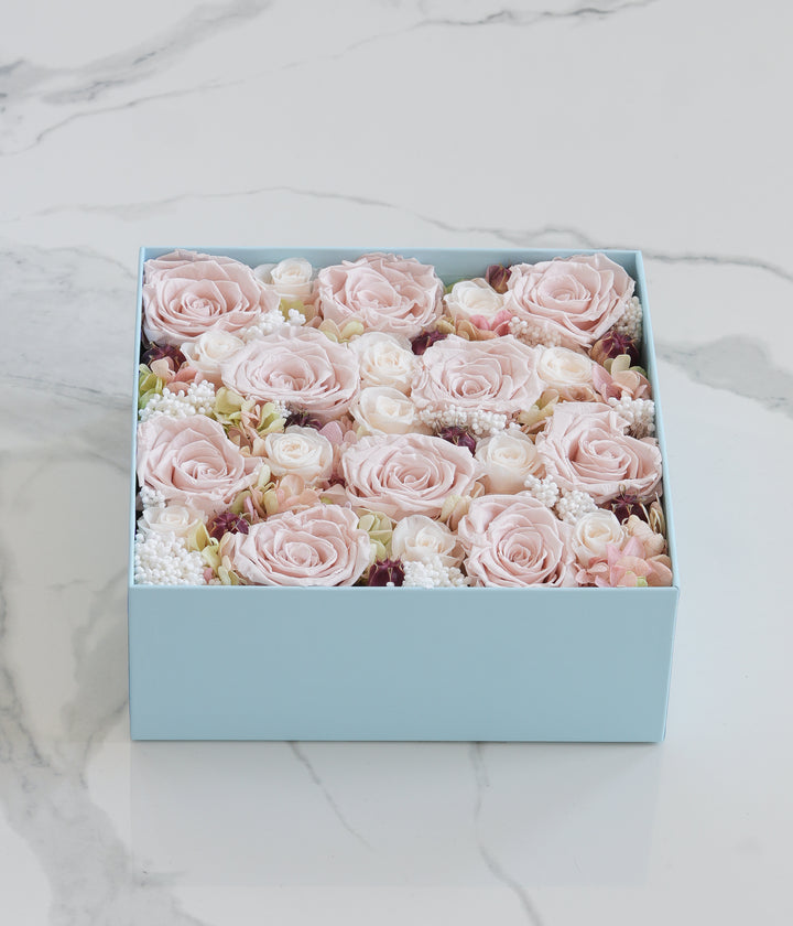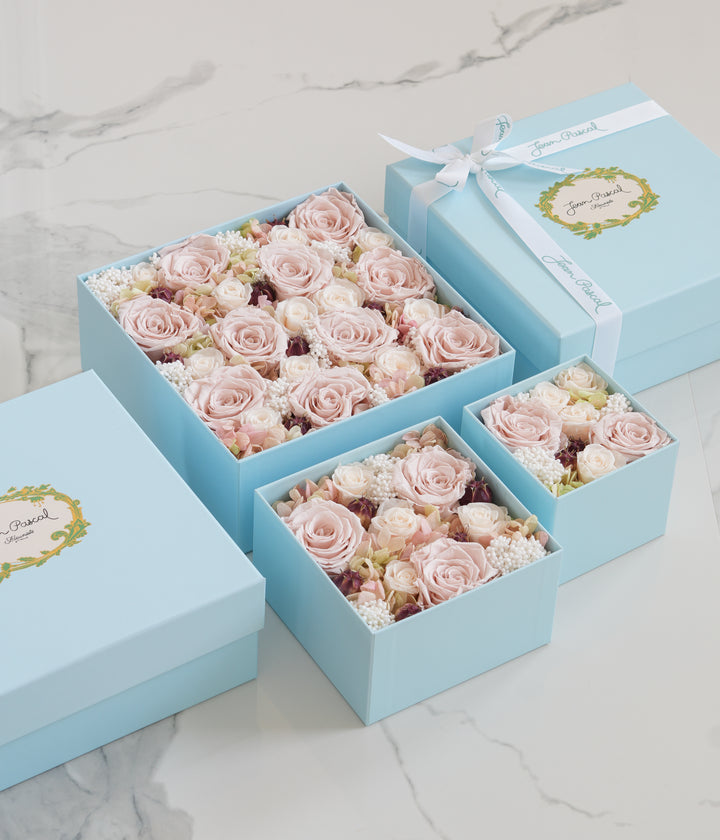 Dusty Pink Forever Roses and Preserved Flowers delicately nestle in Jean-Pascal’s Signature Box for a truly long-lasting gift.