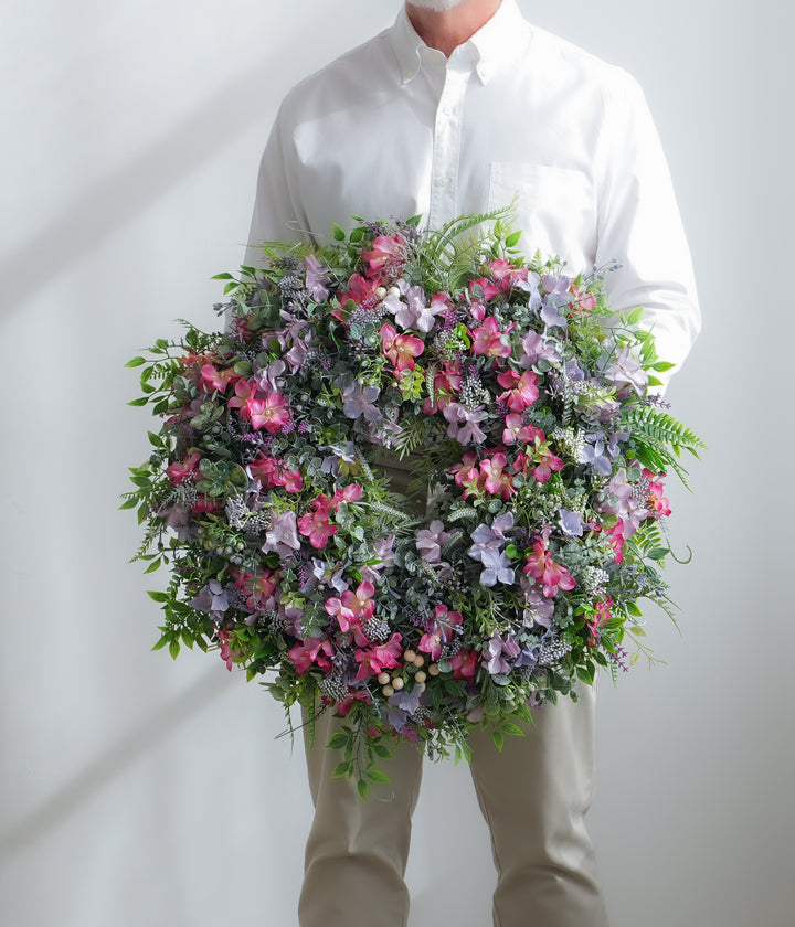A lush 22 x 22-inch decorative wreath composed of layered greenery with soft lavender and pink florals. Designed with fullness, depth, and natural movement, it evokes a romantic garden aesthetic.