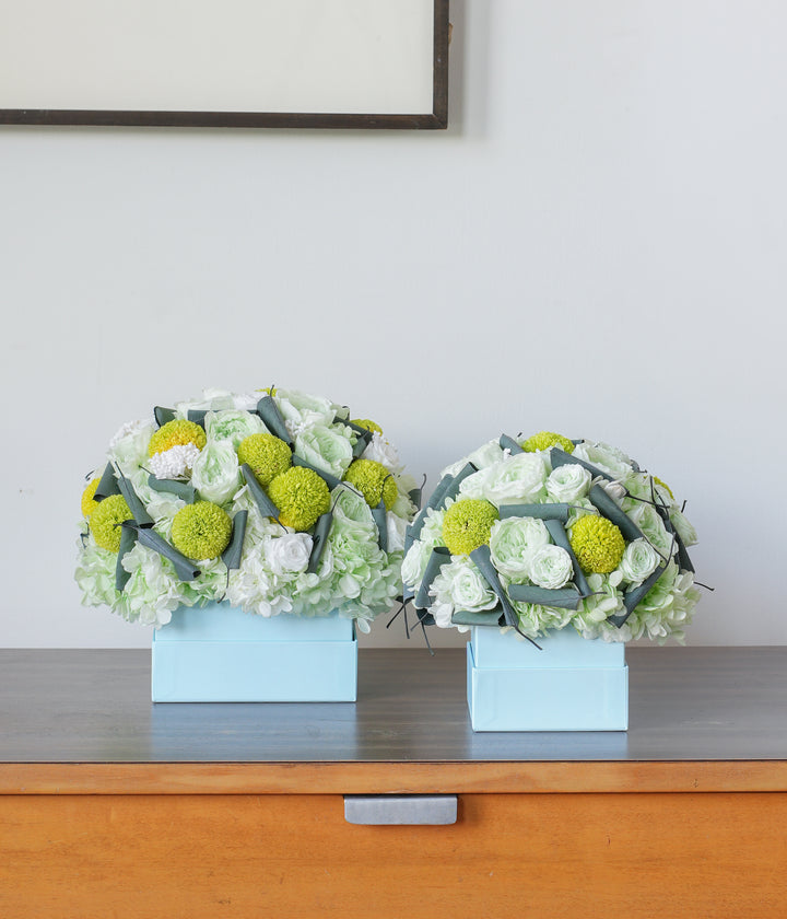 We are delighted to introduce our new lush green preserved flower arrangement. This exquisite ensemble features roses, hydrangeas, chrysanthemums and carnations in a beautiful green and white color palette, presented in our signature Jean-Pascal blue box. A perfect gift that lasts for years.