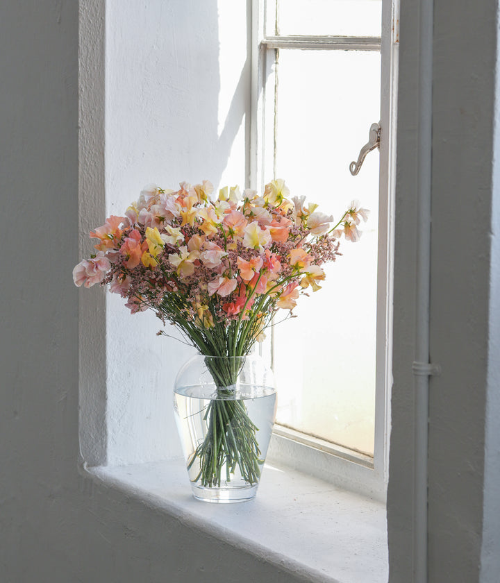 Thirty stems of premium sweet peas in soft peach, apricot, and warm sunset tones, delicately hand-tied in our signature European style. Light, airy, and beautifully fragrant, their ruffled petals create an effortless romantic silhouette.