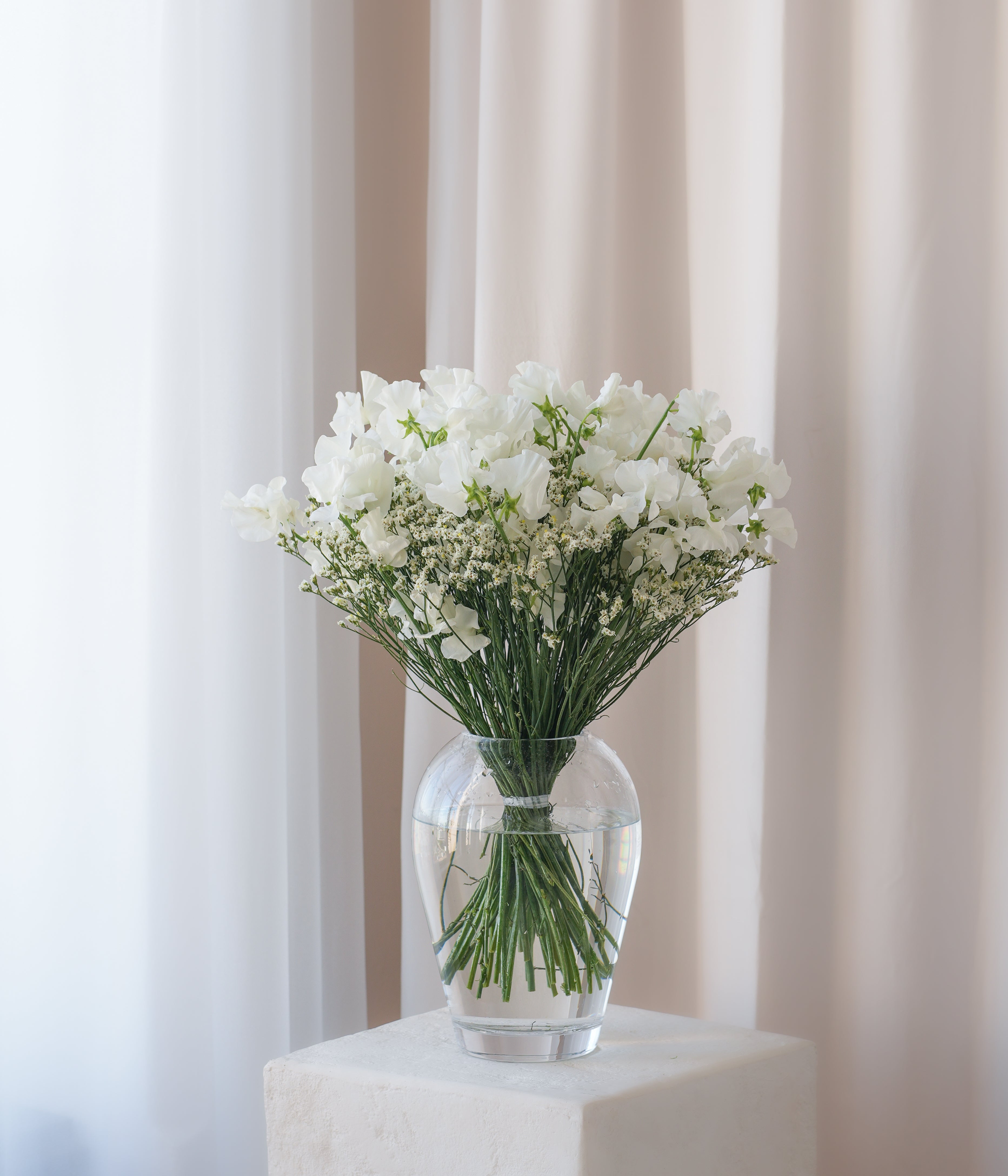 Thirty stems of premium white Japanese sweet peas, delicately hand-tied in our signature European style. Light, airy, and beautifully fragrant, their soft ruffled petals create a refined and timeless silhouette.