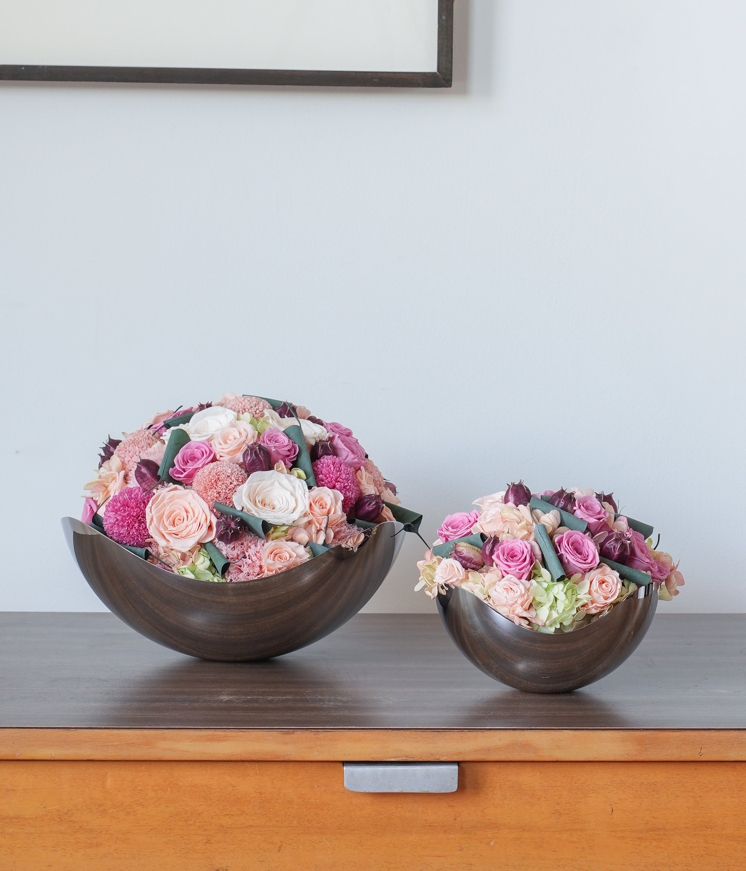 Introducing our Mireille preserved arrangement. This beautiful ensemble features roses, hydrangeas, and carnations in an exquisite peach and pink color palette. The arrangement is elegantly presented in a stunning George Jensen mirror-polished stainless steel flower vase.