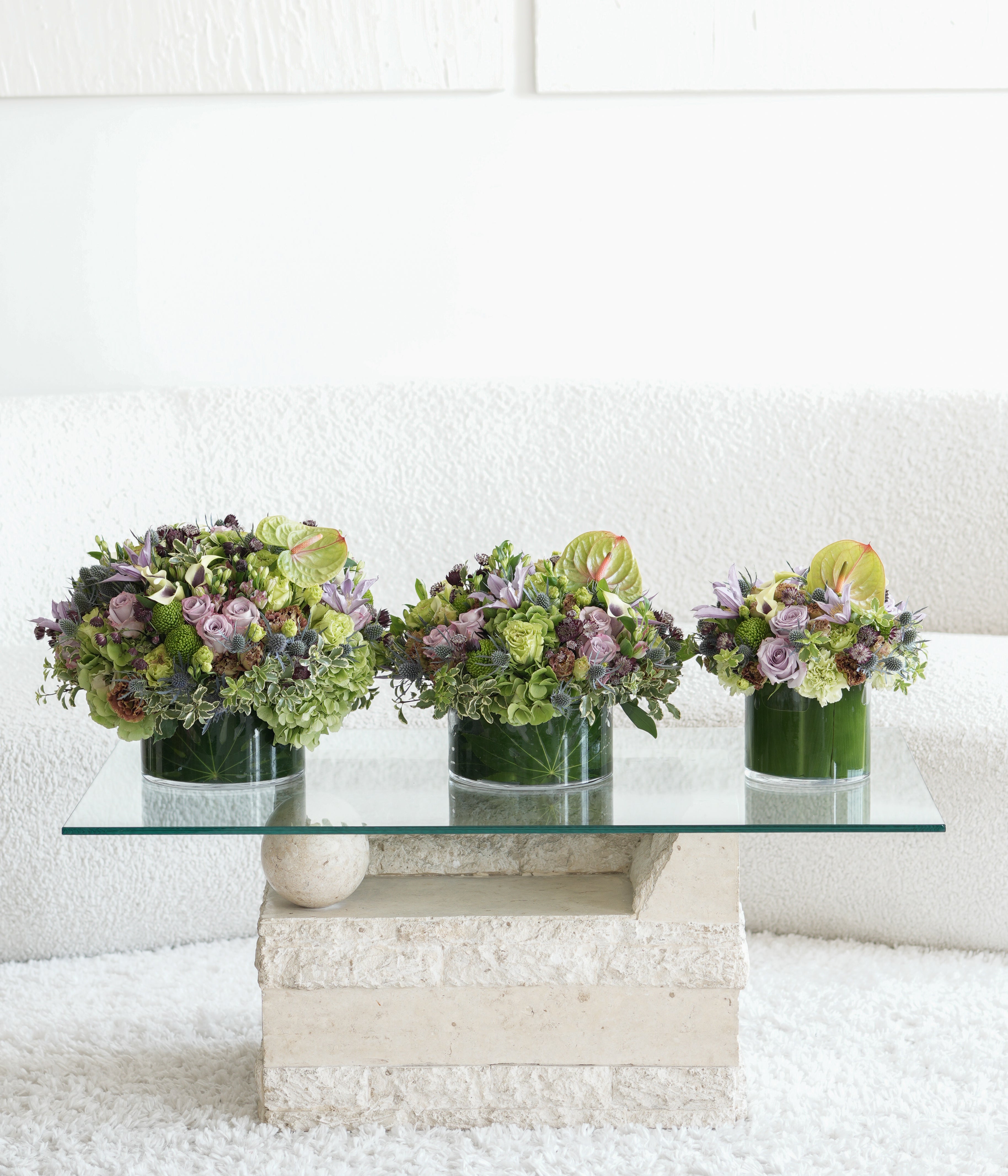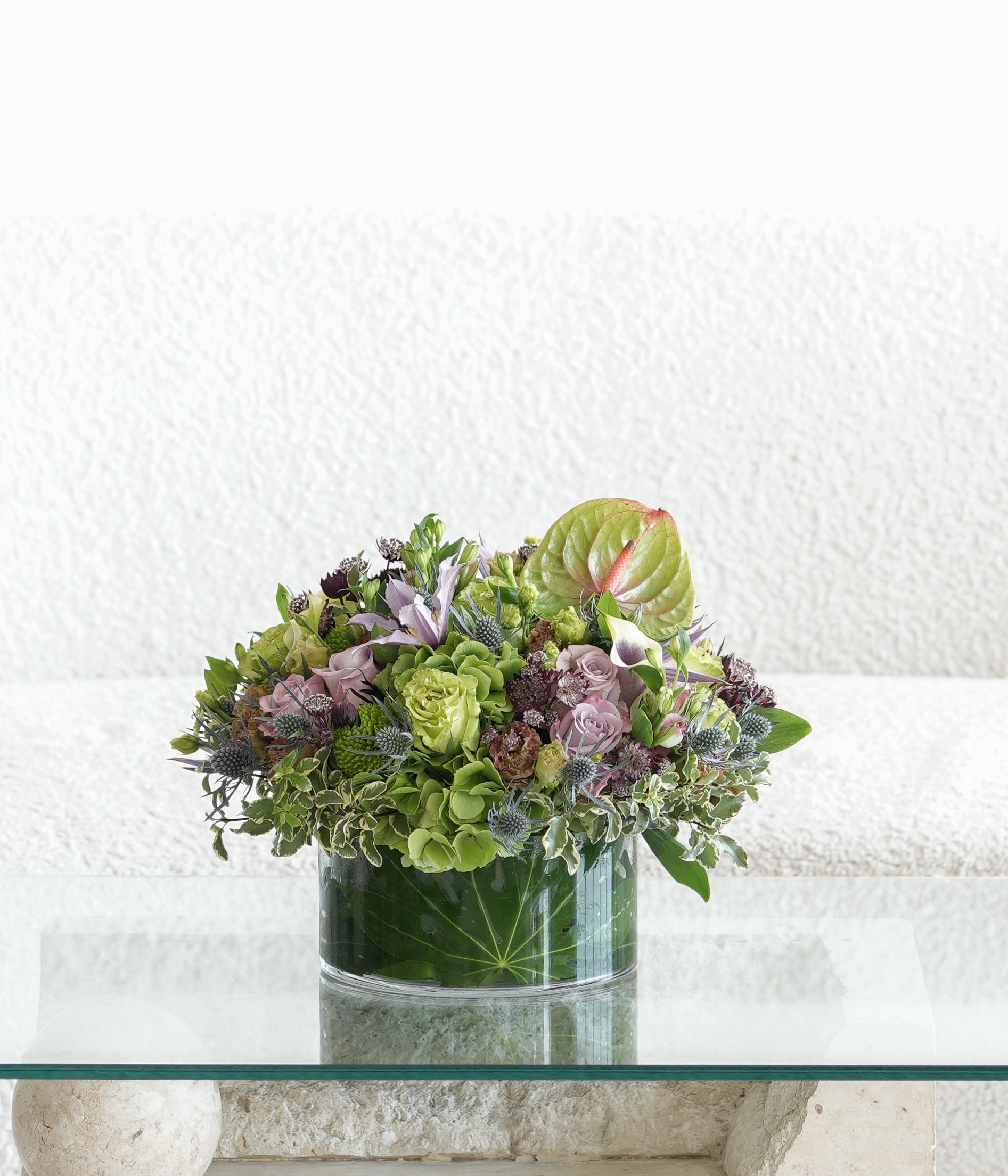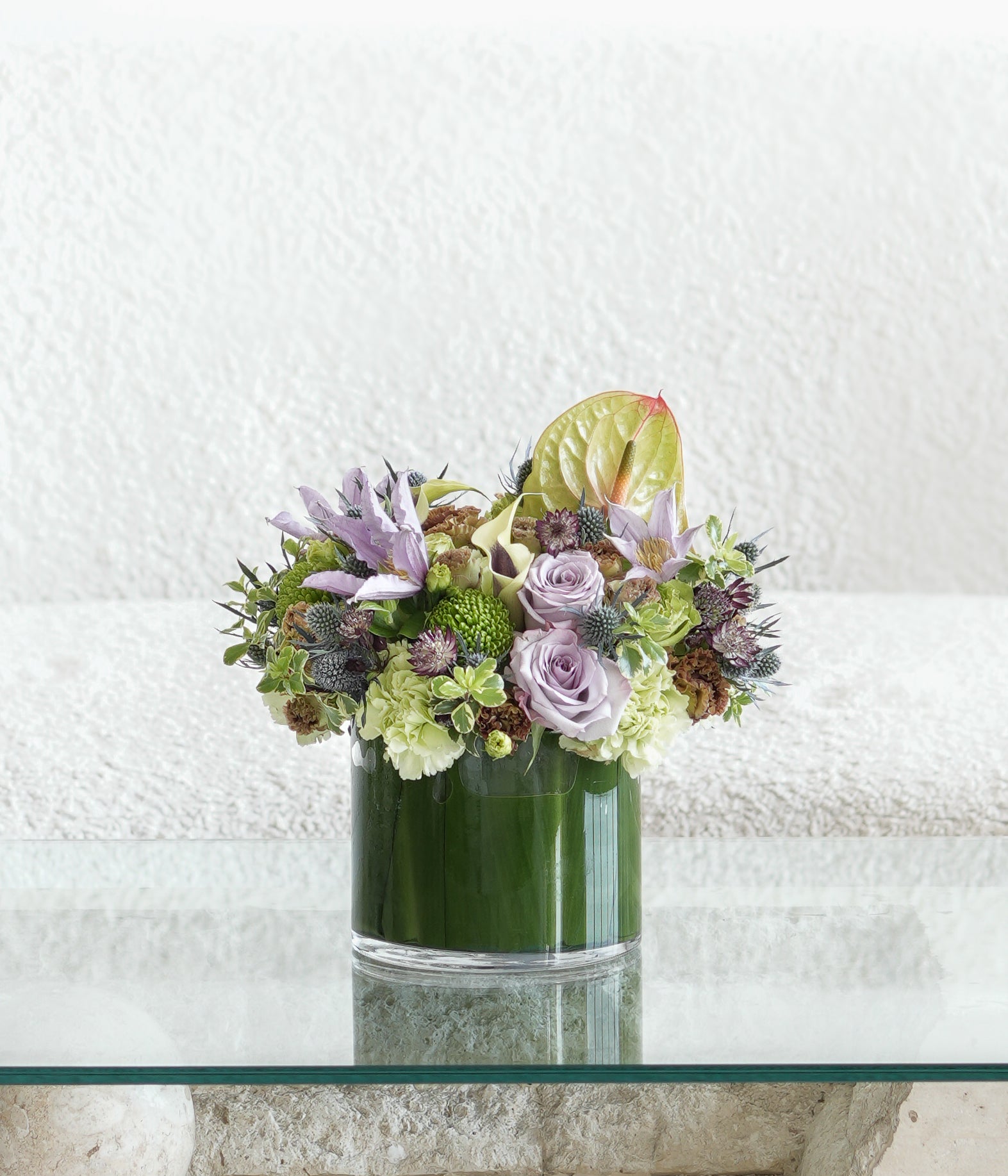 This high style arrangement includes gorgeous Callas and unique green Anthuriums. Lavender and green seasonal blooms will be carefully selected from our daily fresh arrivals.