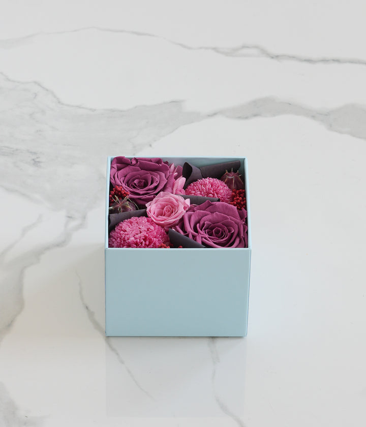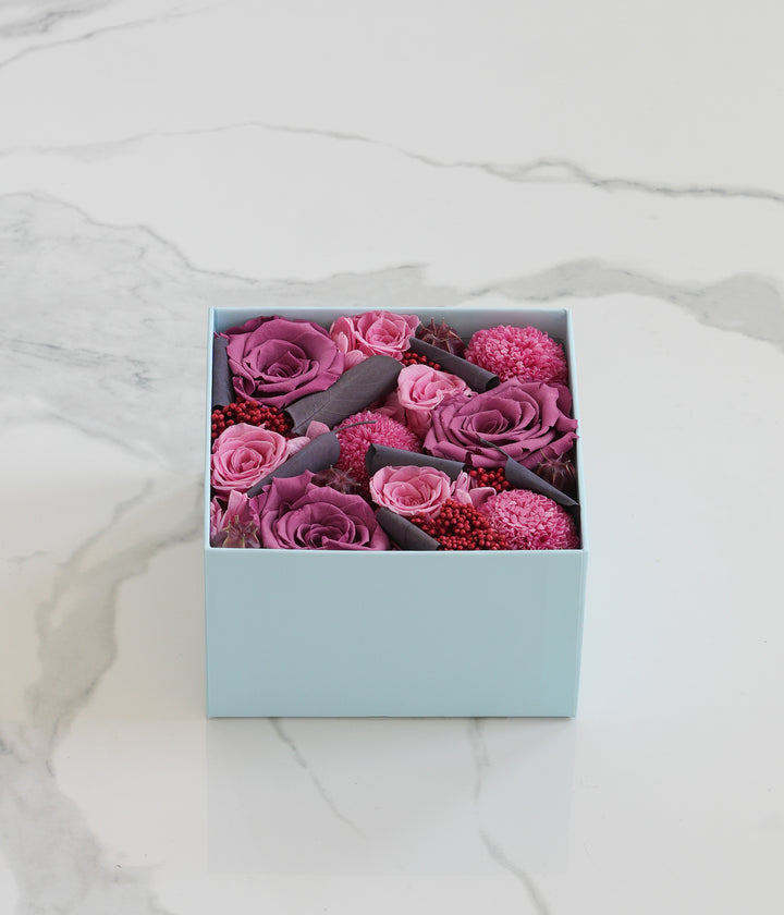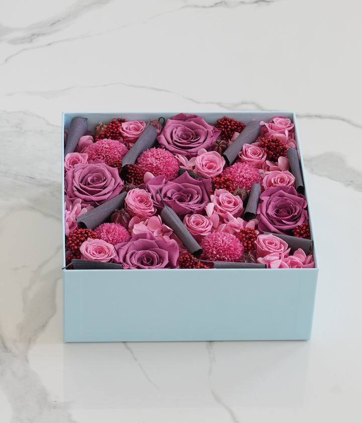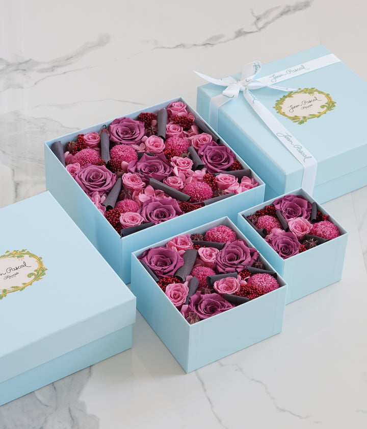 Moody Pink Forever Roses and Preserved Flowers delicately nestle in Jean-Pascal’s Signature Box for a truly long-lasting gift.