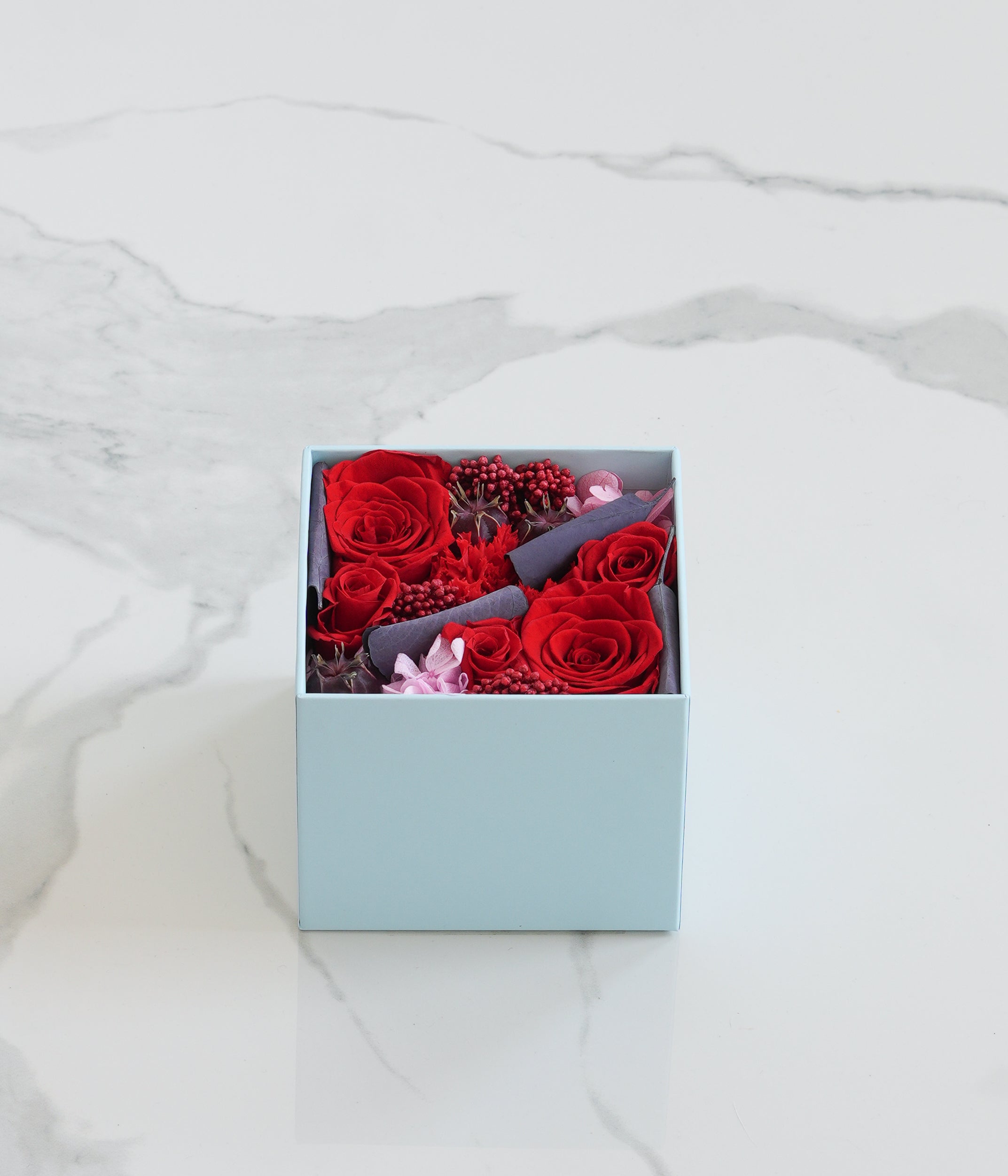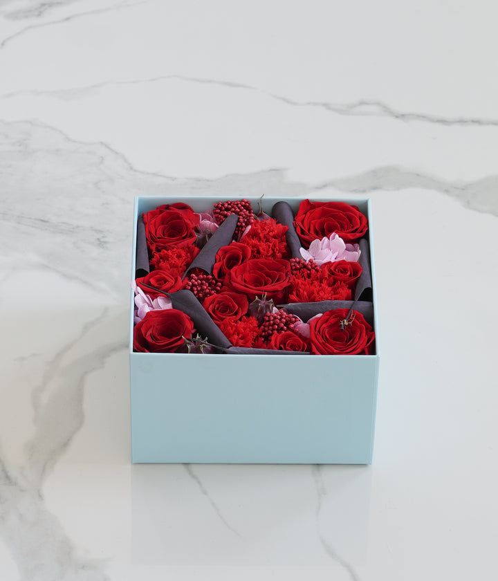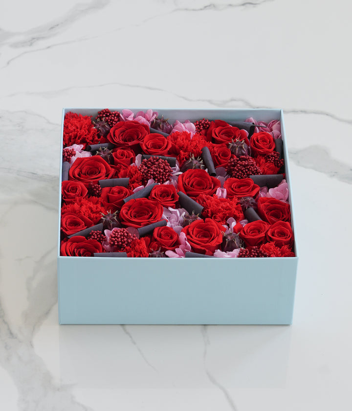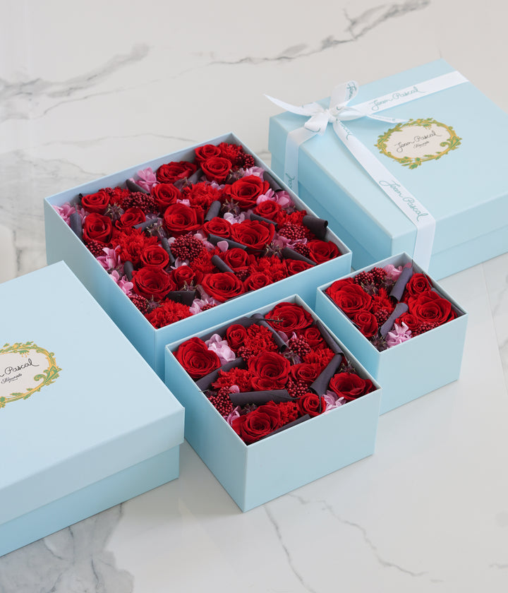 Red Forever Roses and Preserved Flowers delicately nestle in Jean-Pascal’s Signature Box for a truly long-lasting gift.