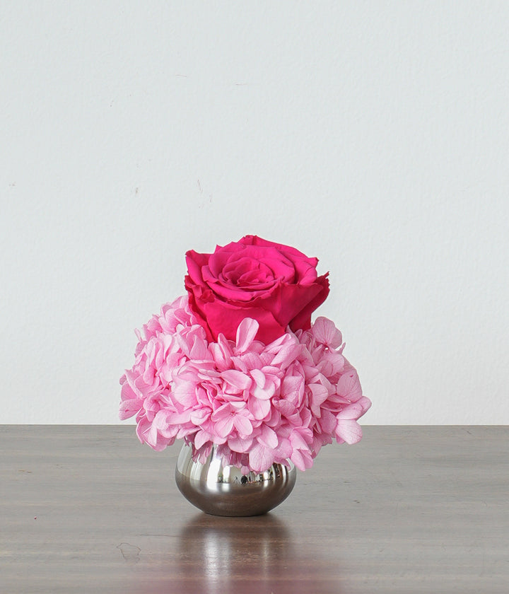Introducing Petite Pink preserved arrangement. This beautiful ensemble features a single rose and hydrangeas in an exquisite bright pink color palette. The arrangement is elegantly presented in a stunning George Jensen mirror-polished stainless steel flower vase.
