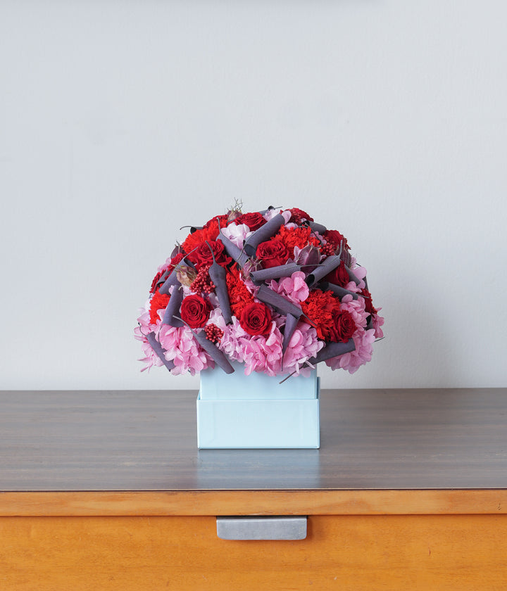 Presenting our Petite Red Passion preserved flower arrangement. This exquisite ensemble features roses, hydrangeas and carnations in a beautiful red and pink color palette, presented in our signature Jean-Pascal blue box. A perfect gift that lasts for years.