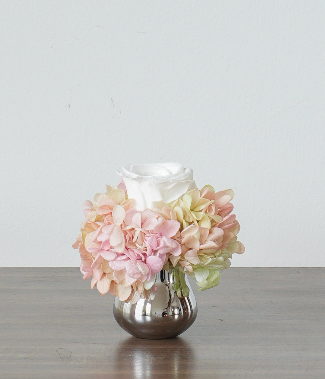 Introducing Petite White preserved arrangement. This beautiful ensemble features a single white rose and hydrangeas in an exquisite peach and white color palette. The arrangement is elegantly presented in a stunning George Jensen mirror-polished stainless steel flower vase.