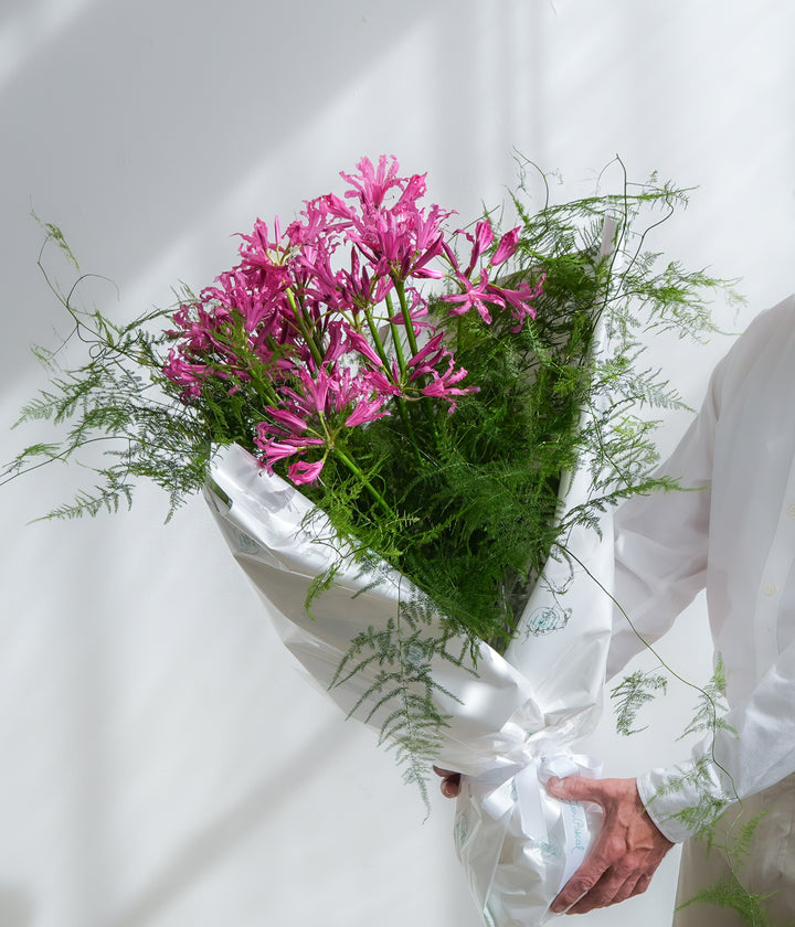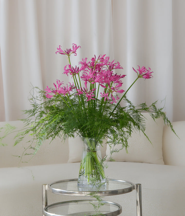 Twenty Elegant pink nerine with delicate, sculptural petals, hand-tied in our signature European style. Accented with airy greenery for lightness and natural movement. A perfect option for long lasting arrangement lovers.