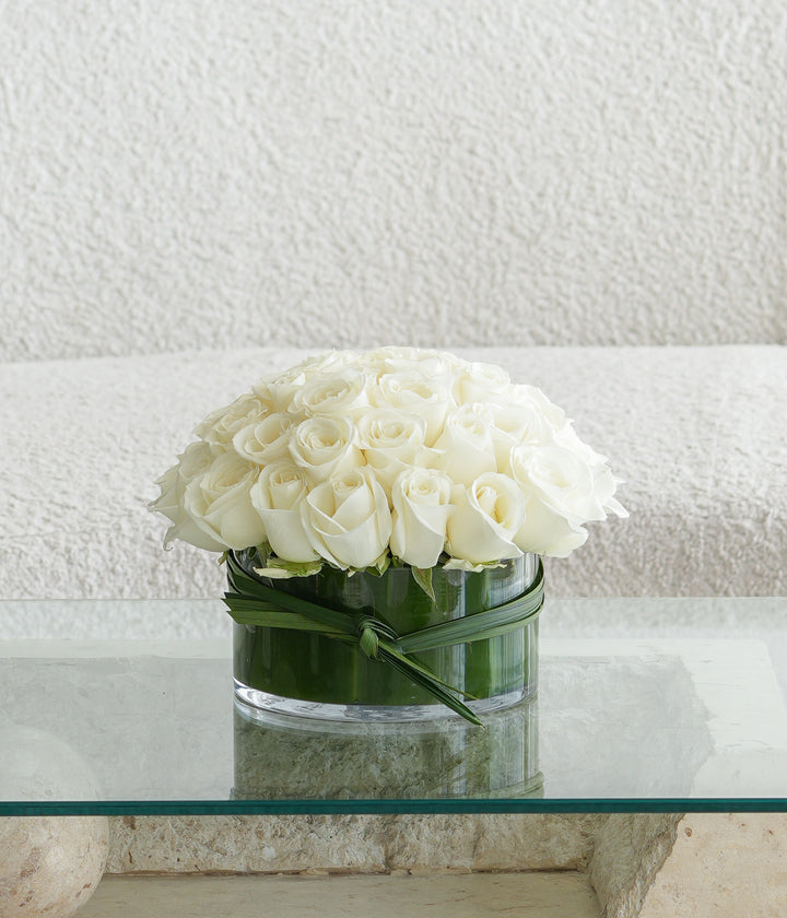 A stunning dome of pristine white roses, meticulously arranged in a sleek glass vase wrapped with natural greenery. This design radiates understated luxury and timeless elegance, perfect for making a refined statement in any space.