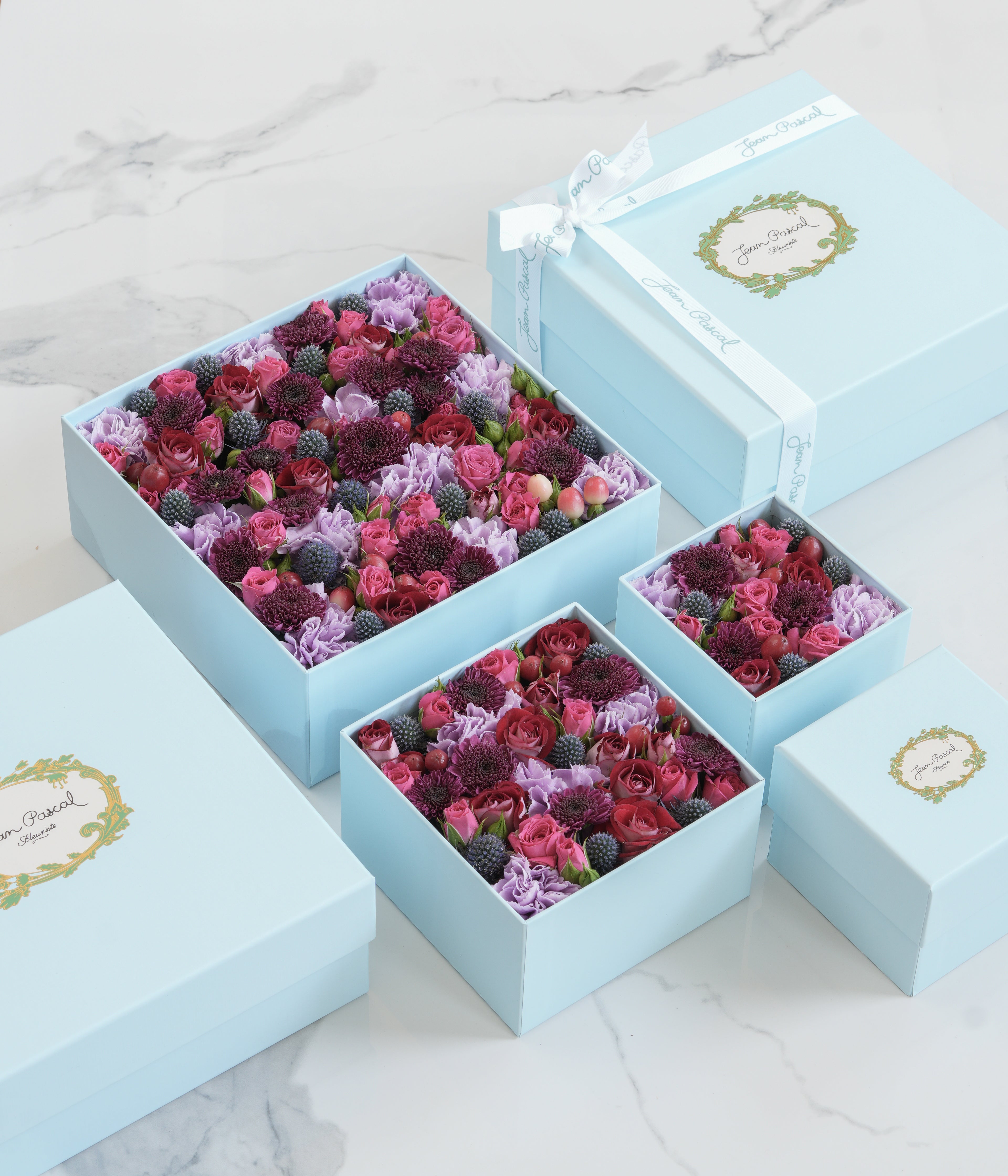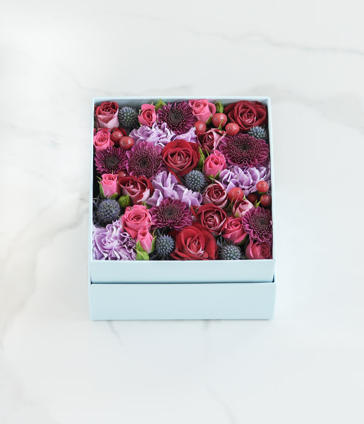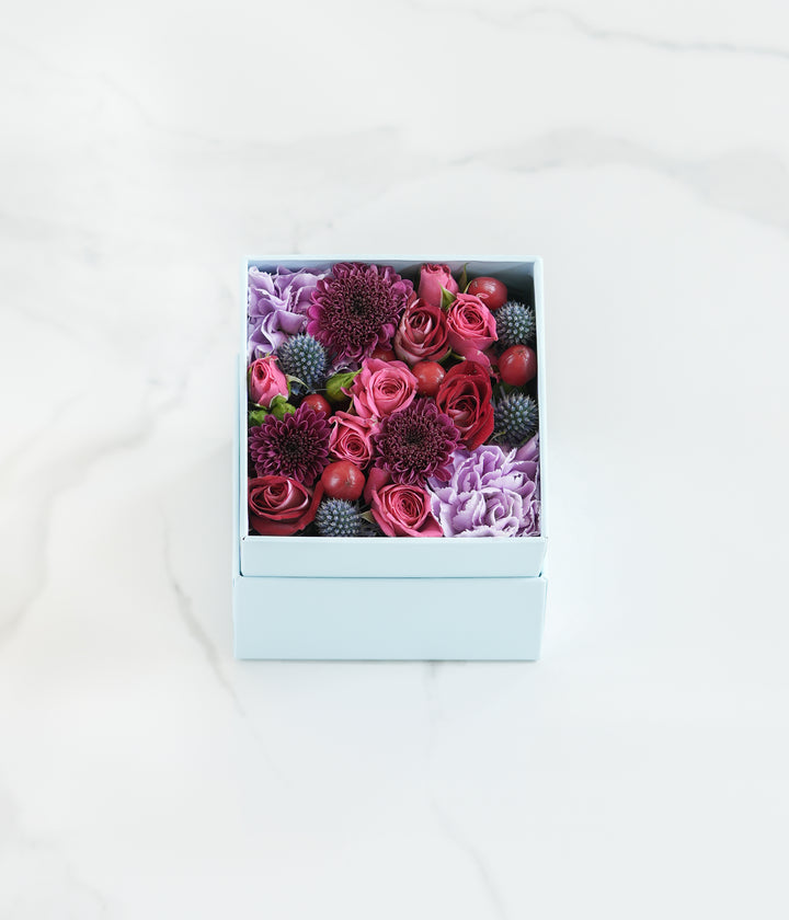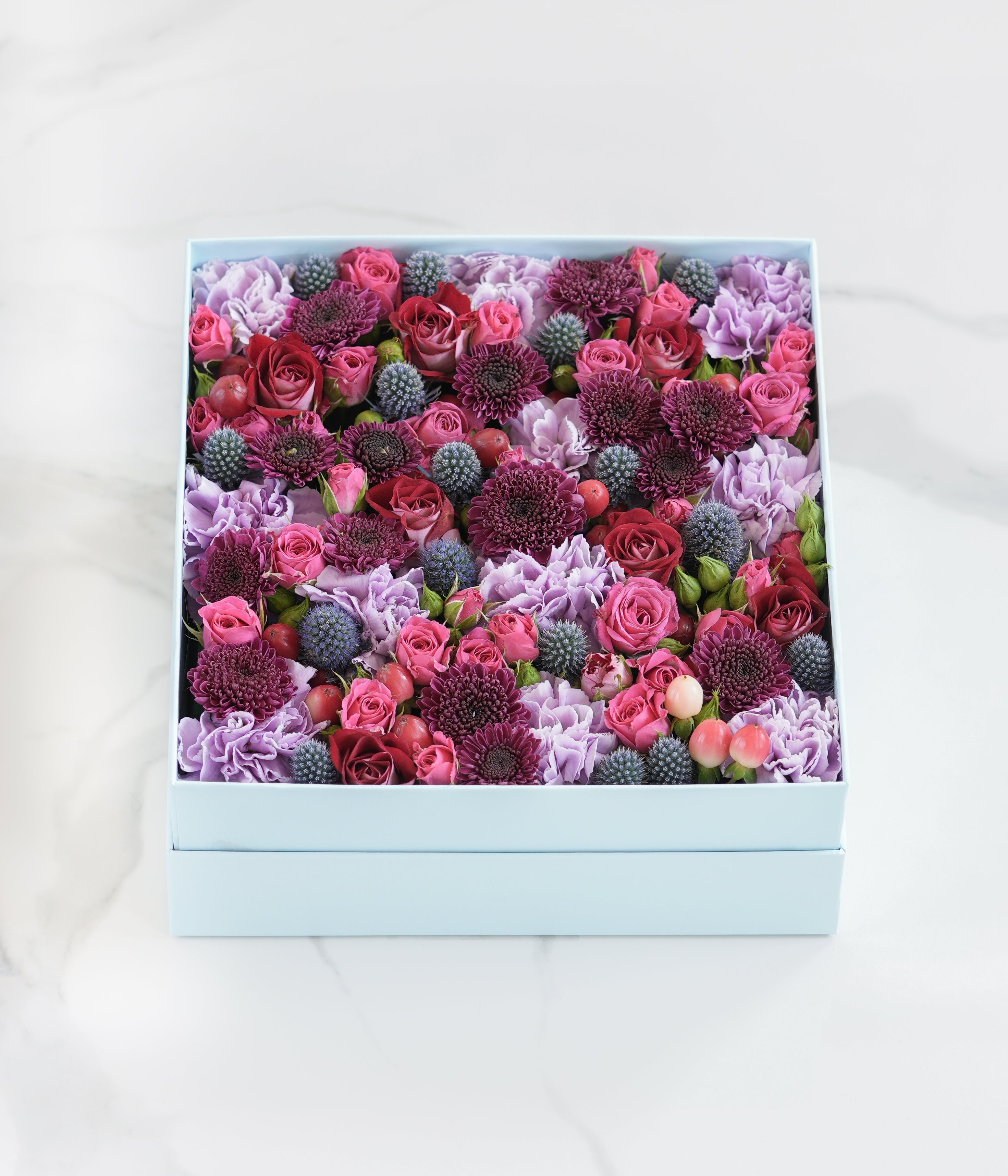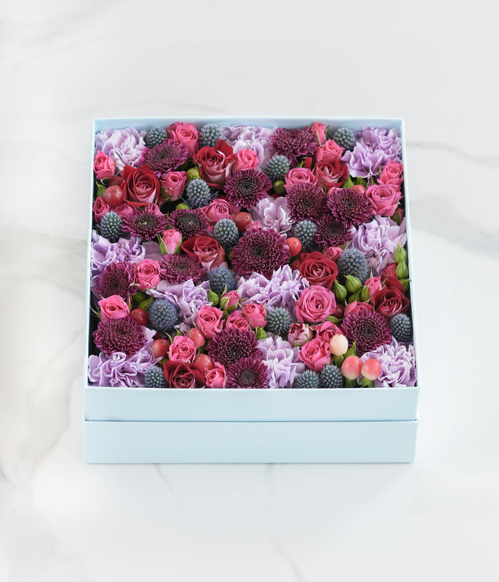A Fresh Flower Box that surprises you. Filled with Dark Berries colored flowers, this present includes Hot Pink Miniature Roses and Blue Eryngium.